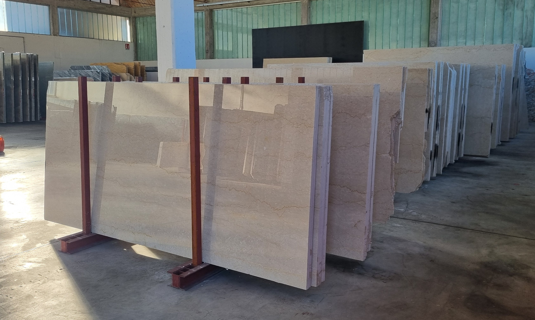 Botticino. Marmo. Origine: Italia. Utilizzo: interno ed esterno. Lastre lucide - magazzino.